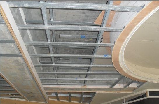 吊頂及隔墻采用輕鋼龍骨材料,主輔龍骨合理布局,使用專用配套連接吊件,與傳統(tǒng)的木結構吊頂相比,杜絕了變形開裂和防火安全等問題。