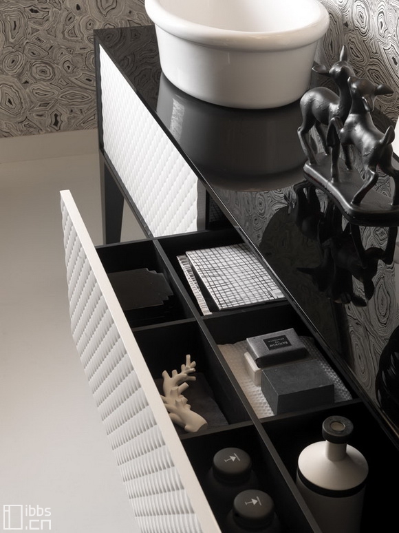 ▲盥洗區(qū)上部分選用箱型鏡柜,能收納各類洗浴用品。與視線平行的視覺感受,取拿物品更方便。